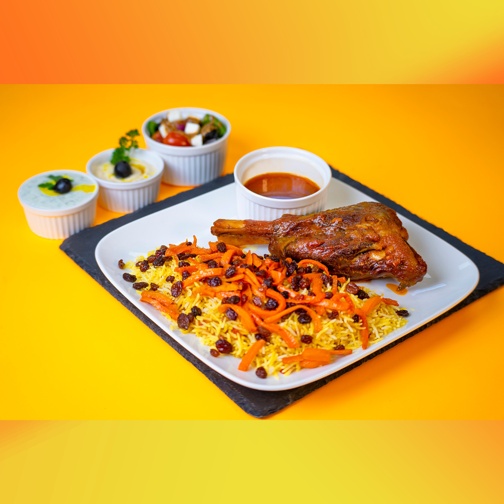 Slow-cooked, tender lamb shank served with your choice of fragrant saffron rice or our signature Kabuli Pulao with raisins and carrots. Accompanied by fresh Greek salad, oven-baked potatoes, creamy hummus, and your choice of delicious sauces.
