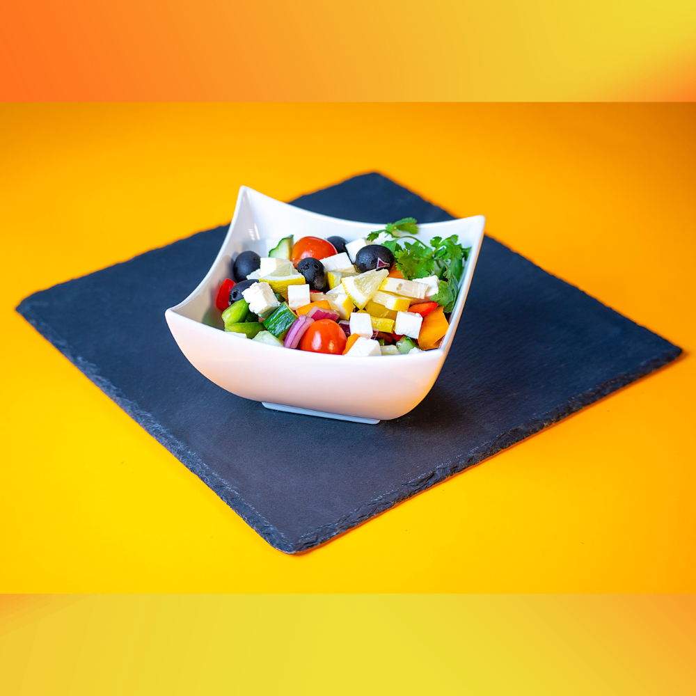 A fresh Mediterranean salad made with colourful bell peppers (yellow, red, green, orange), cucumber, grape tomatoes, olives, red onions, fresh cilantro, and crumbled feta cheese. Served with our signature In & Win sauce