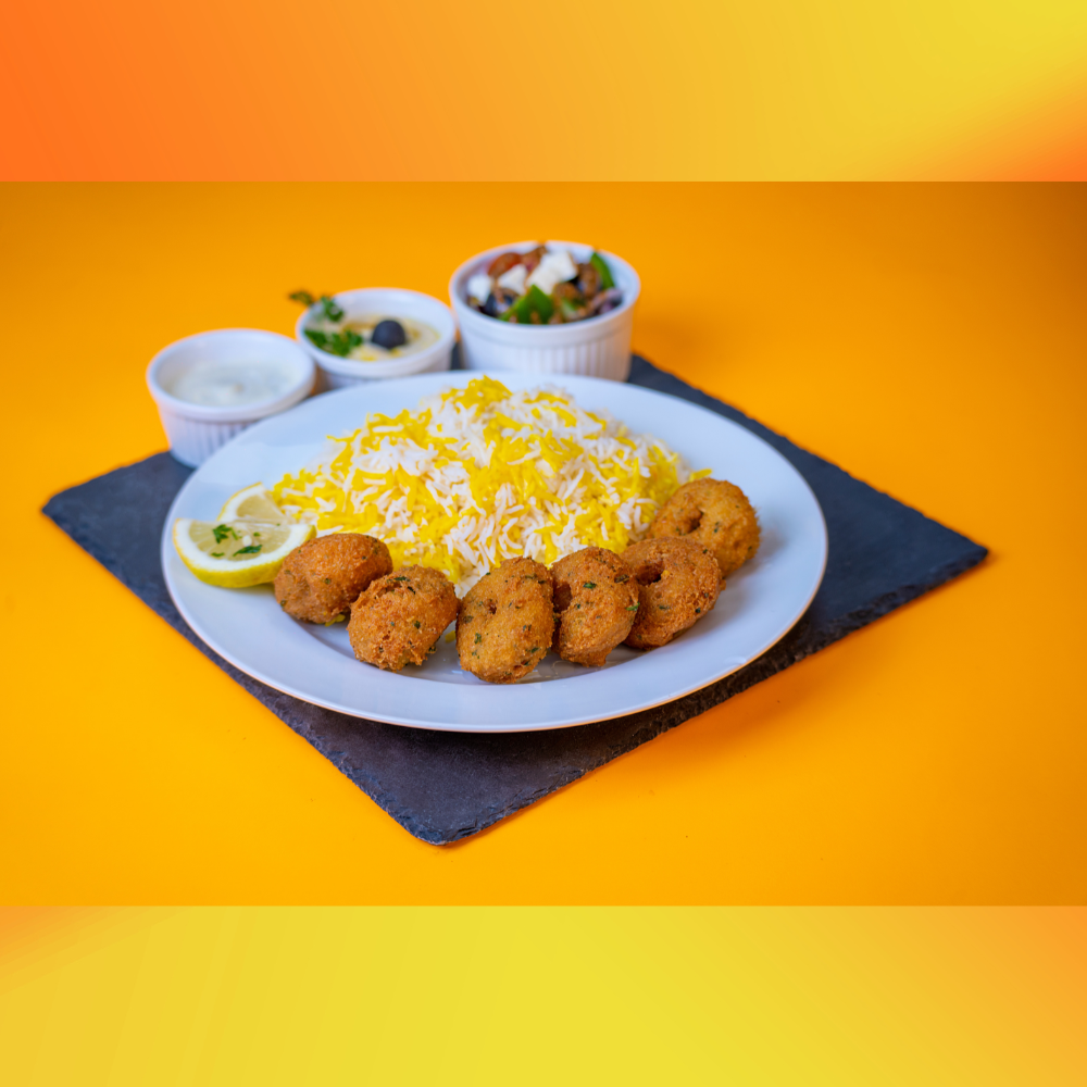 Crispy, golden falafel served with your choice of fragrant saffron rice or our signature Kabuli Pulao with raisins and carrots. Comes with fresh Greek salad, oven-baked potatoes, creamy hummus, and your choice of delicious sauces. A perfect vegetarian option, full of flavour and freshness.