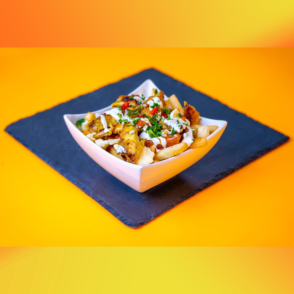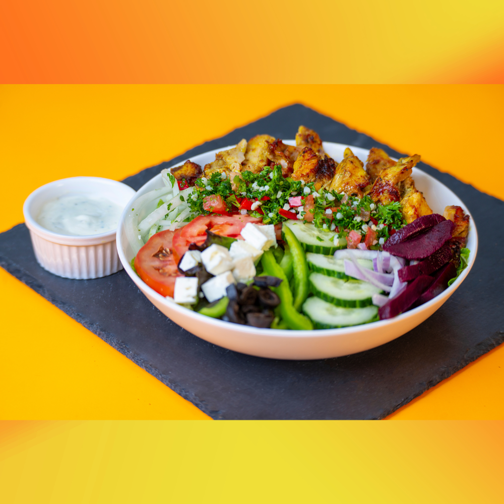 Looking for a tasty, fresh, This is the perfect choice! Juicy, seasoned chicken donair served over fragrant saffron rice or our delicious Kabuli Pulao with raisins and carrots. Comes with crisp Greek salad, oven-baked potatoes, creamy hummus, and a variety of tasty sauces. A perfect mix of flavour and freshness you’ll love
