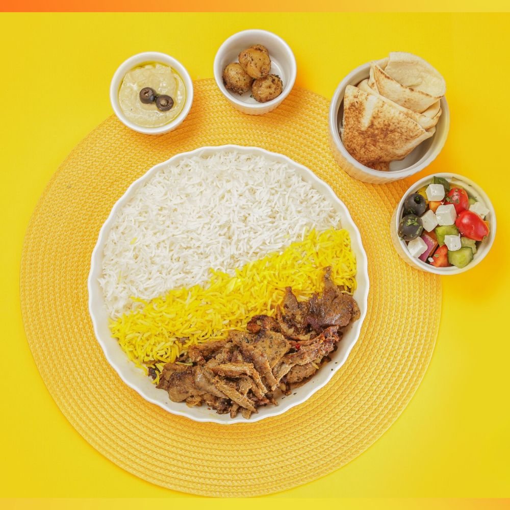Craving bold flavour? Our juicy, perfectly seasoned beef donair is served over your choice of fragrant saffron rice or traditional Kabuli Pulao with raisins and carrots. Complete with fresh Greek salad, oven-baked potatoes, creamy hummus, and a variety of delicious sauces. A satisfying, flavour-packed meal you won’t forget
