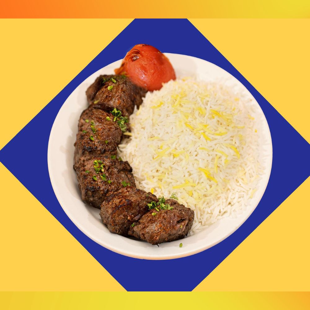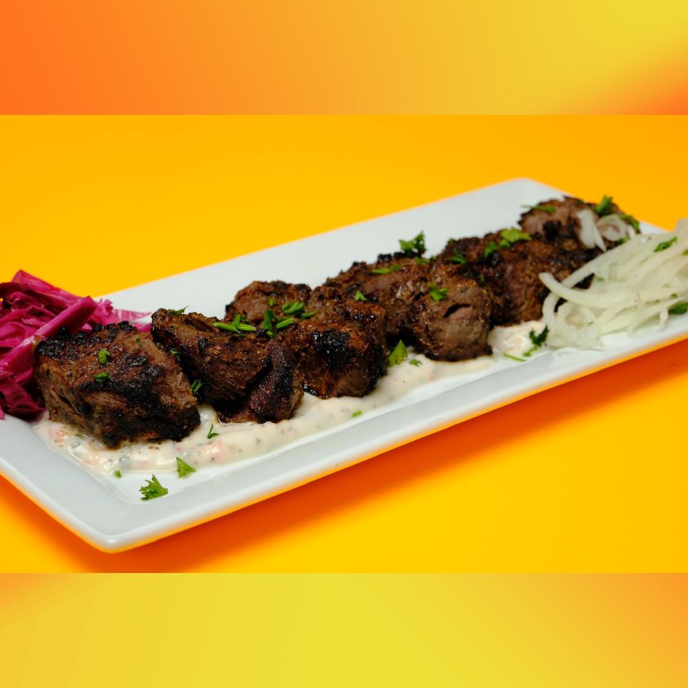 A succulent skewer of tender, marinated chicken kabab, expertly grilled to perfection. Served with your choice of aromatic saffron rice or traditional Afghan Qabili Pulao, accompanied by fresh lemon wedges, finely chopped onions, and our signature In & Win sauce.