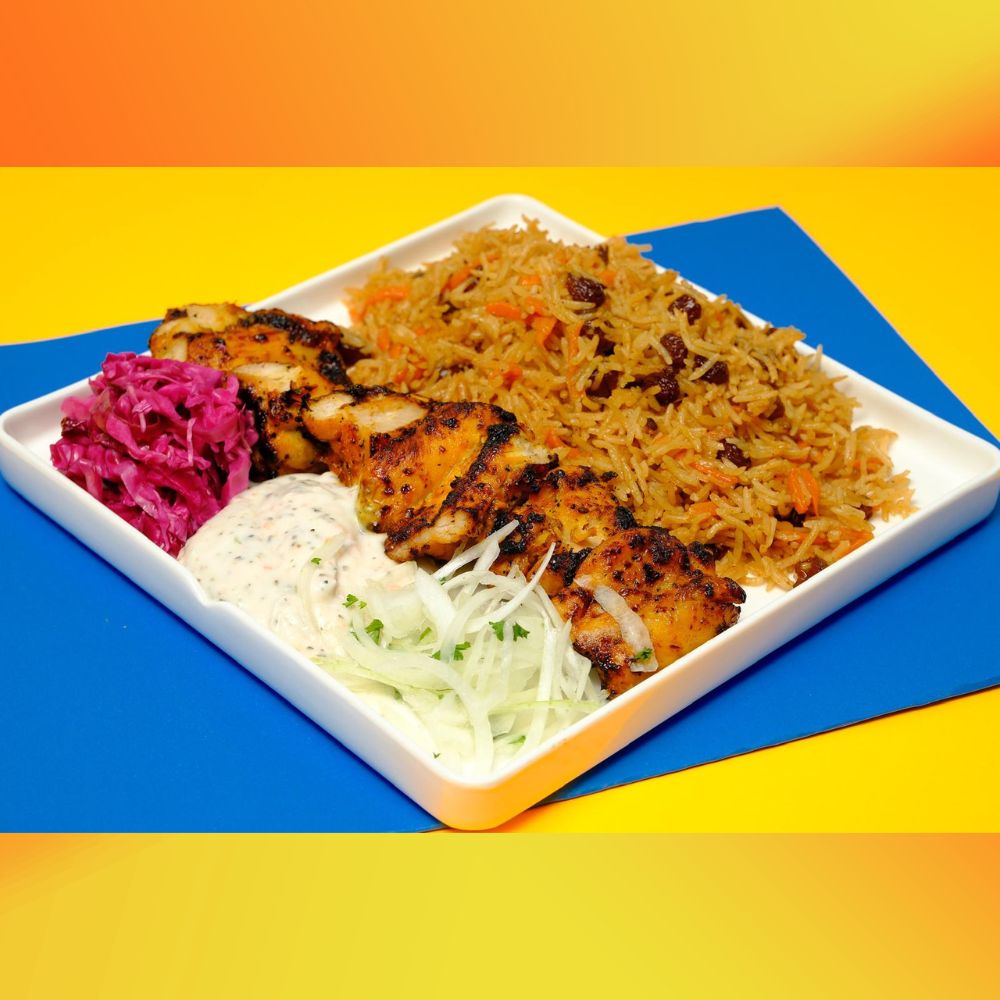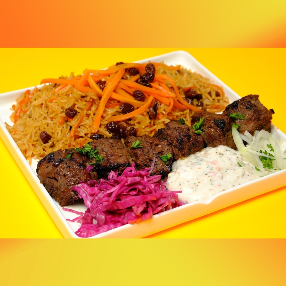 Tender lamb kabab served with traditional Afghan Qabili Pulao — made with premium rice, raisins, carrots, and almonds. Comes with our special In & Win sauce.